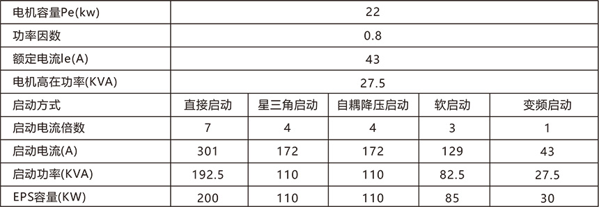 EPS容量-带变频启动功率之和+带软启动电机功率之和×3倍十星三角启动电机功率之和×4倍十直接启动之和×7