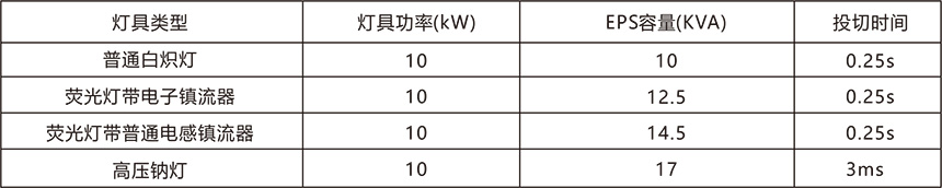 2、当负载为电子镇流器日光灯,EPS容量=电子镇流器日光灯功率×1.2倍;